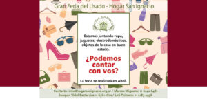 Ya falta menos para nuestra próxima Gran Feria del Usado «Hogar San Ignacio». Aún tenes tiempo para DONAR! Te pasamos a buscar las cosas por tu casa.LLamanos o Escribimos y coordinamos.TODO LO RECAUDADO EN LA FERIA SERÁ DESTINADO PARA PAGAR EL TRATAMIENTO DE LOS CHICOS QUE HOY ESTÁN ALOJADOS EN EL HOGAR.Contacto: info@hogarsanignacio.org.ar – Celular: 11 21872956